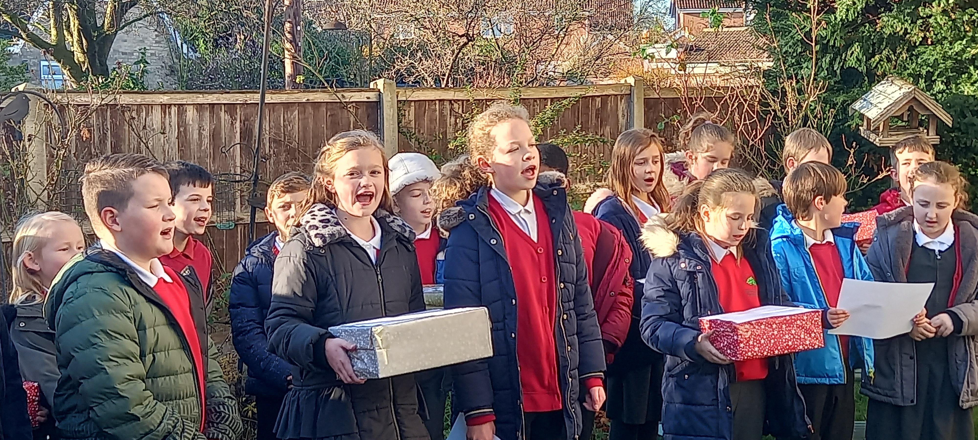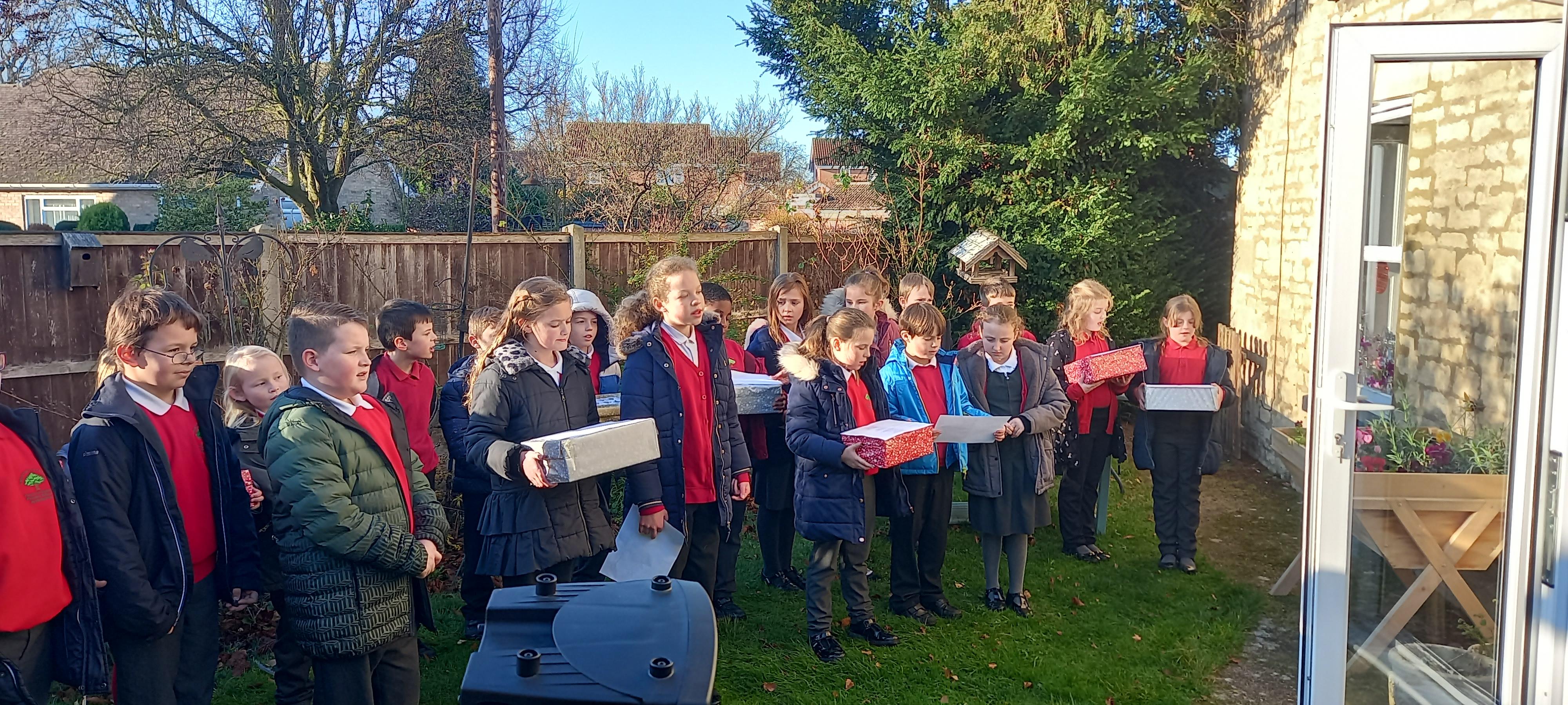 We have prepared over 40 caring Christmas boxes for the nominations we received and also to take to Chestnuts Care home for each resident. On Thursday pupils from year 4 and 5 delivered the boxes to Chestnuts, whilst we were there we sung a few carols and songs from the garden area to the residents in their day room.