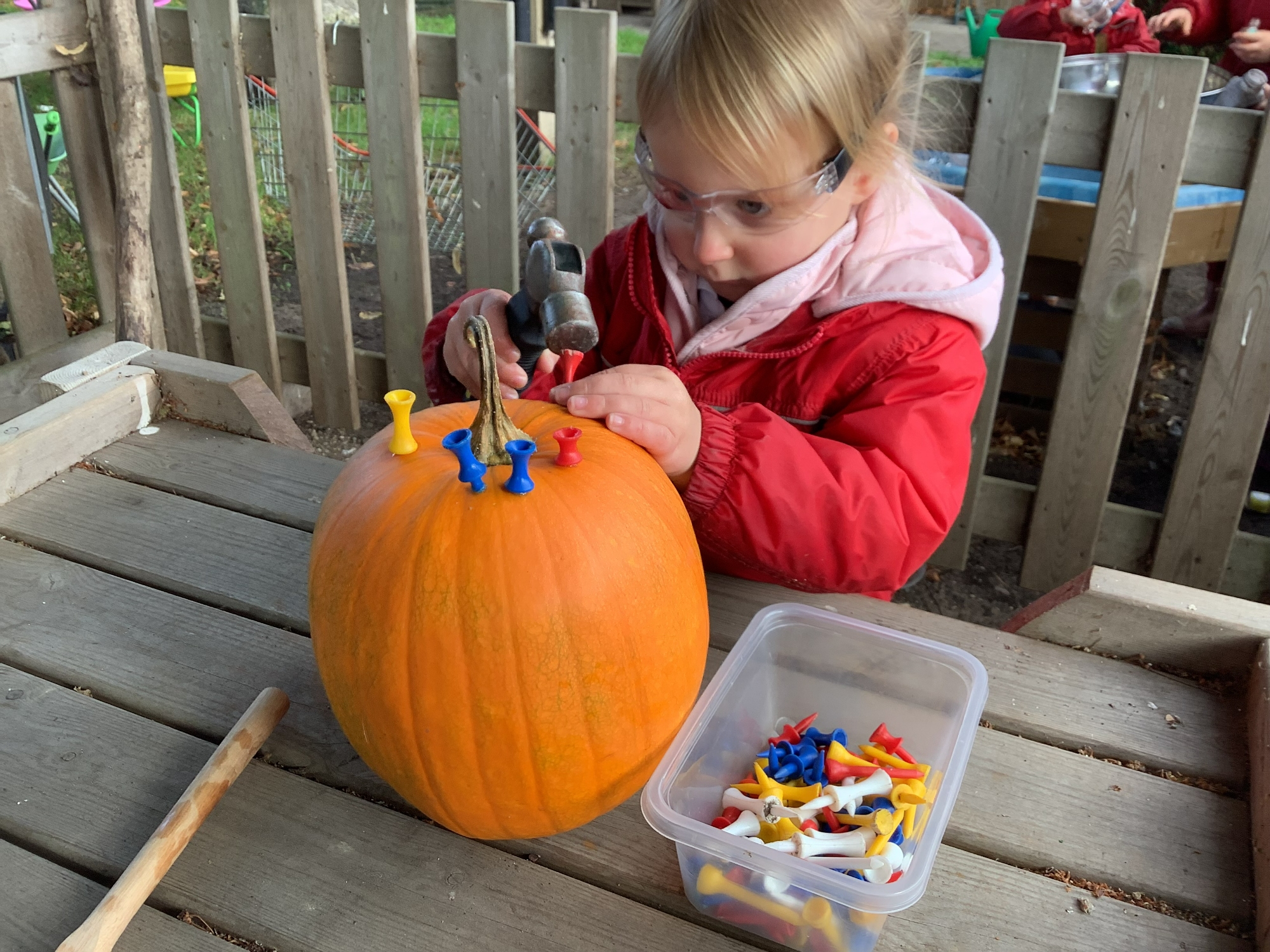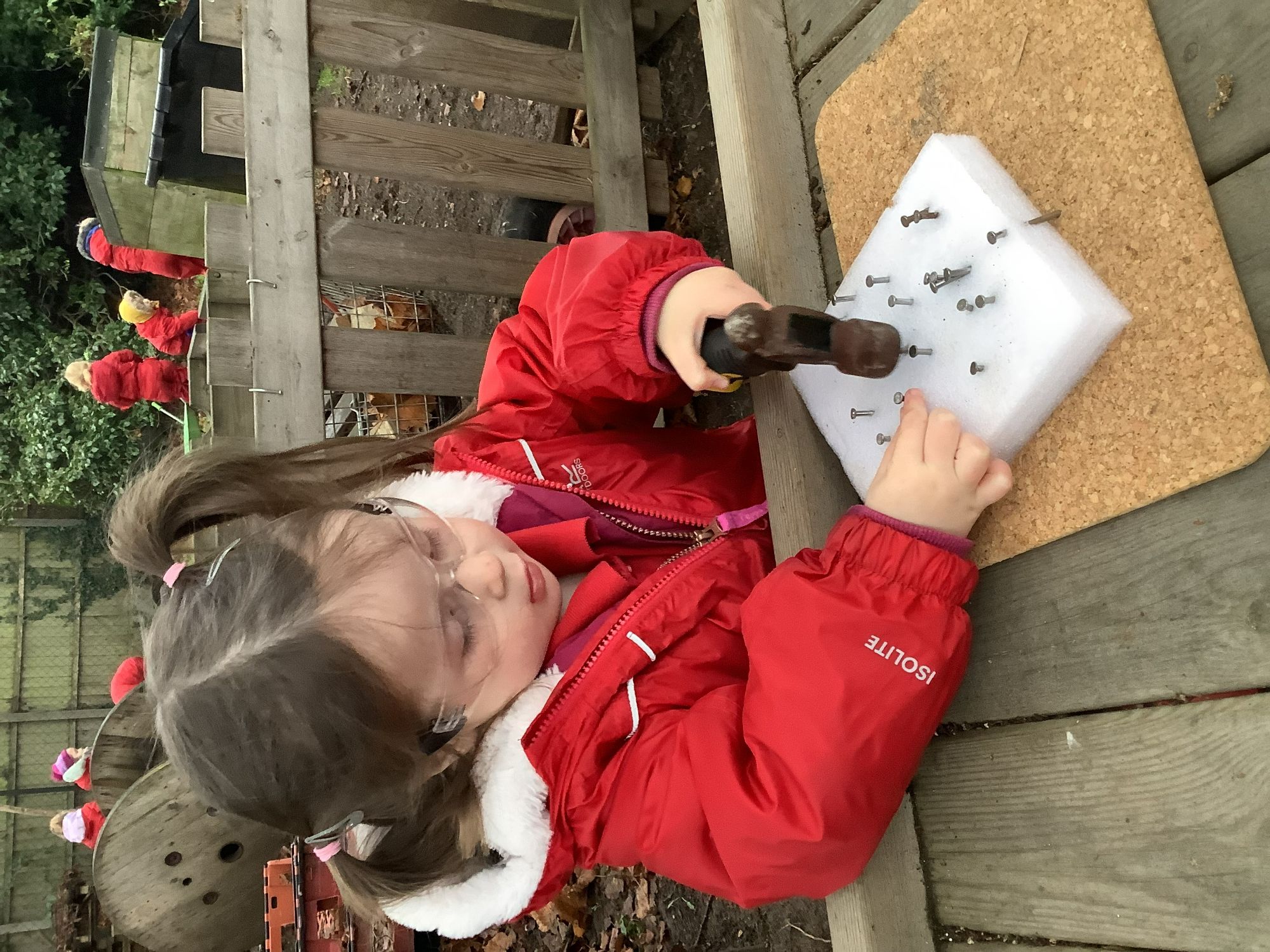 Their initial learning is with hammers and nails into chunky cardboard to learn to grip and use the hammer effectively and to build stamina and strength. They then progress to using wood and to using screwdrivers and saws as the year goes on.